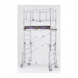 Montage en sécurité par une personne à 3 m plancher en moins de 3 minutes Garde corps monoblocs, système de guidage anti-écrasement, plancher de 152 x 60 cm réglable tous les 25 cm, roues Ø 150 mm réglables au pas de 1,25 sur 18 cm, charge maxi : 200 Kg, garantie 3 ans.