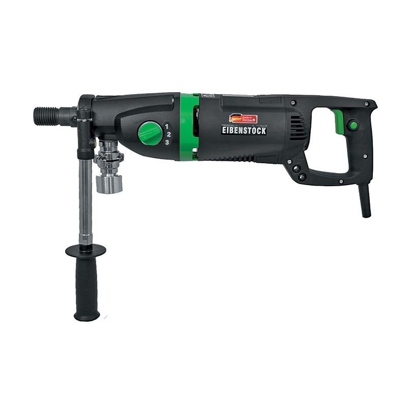 Raccordement direct pour l'arrivée d'eau, démarrage progressif, embrayage à bain d'huile = lubrification optimale, protection thermique et électronique de surcharge, utilisation en portative ou sur bâti, Ø carottage maxi à eau : 162 mm, Ø carottage maxi à sec : 202 mm, vitesses de rotation : 510 - 1150 - 2500 tr/min, livrée en coffret avec : 1 disjoncteur différentiel, 2 clés (32 et 41), 1 poignée de maintien avec niveau, 1 raccord tête de chat avec embout Gardena, 1 raccord avec embout pour perçage à sec, poids : 6,7 kg.