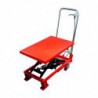 Élévation hydraulique, levée du plateau commandée par pédale, descente du plateau par manette, timon repliable, 2 roues fixes, 2 roues pivotantes avec frein.