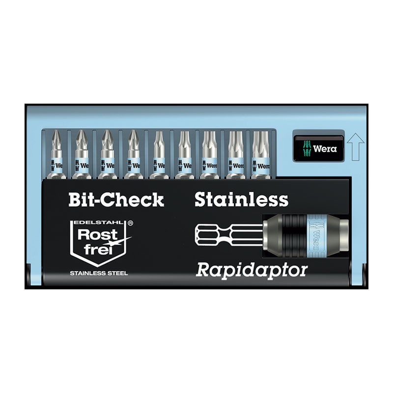 Coffret de 10 pièces comprenant 1 porte-embouts Rapidaptor inox à changement rapide et 9 embouts inox., utilisation préconisée avec des vis inox, composition :, - 1 porte embout 3888/4/1 K 1/4 50mm, - 1 embout 3851/1 TS PH : PH 2 x 25mm, - 3 embouts 3855/1 TS PZ : 1 PZ1 x 25mm - 2 PZ2 x 25mm, - 5 embouts 3867/1 TS TORX® : TX10 - TX15 - TX20 - TX25 - TX30 x 25 mm, particulièrement préconisé pour la pose de vis terrasse et la pose d'éléments décoratifs.