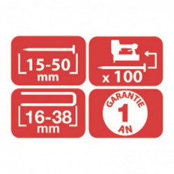 Pour l'agencement, l'assemblage, l'encadrement de portes et de fenêtres, pose de panneaux, montage de meubles, pose de baguettes et lambris, capitonnage, ..., corps en aluminium, échappement orientable à 360°, désenrayage facile, chargement par le haut pour les agrafes et latéral pour les pointes, couteau en acier trempé, indicateur de chargement, pression de service : 4,8 - 7,5 bar, capacité magasin : 100, vitesse : 6 - 7 cycles/sec, consommation d'air : 0,66 L/cycle, 3 consommables :, - pointes AX de 15 à 50 mm, - agrafes étroites L de 16 à 38 mm, - agrafes larges M de 16 à 38 mm, dimensions (L x l x H) : 279 x 62 x 257 mm, poids : 1,30 Kg, livré en coffret.