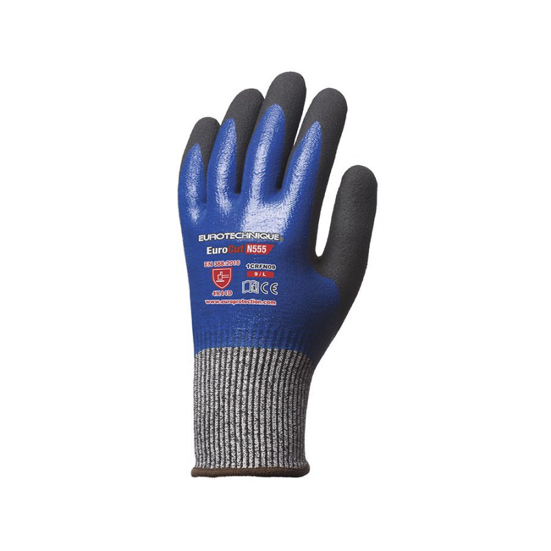 Tricot gris HPPE et fibre de verre, double enduction (nitrile bleu lisse sur la totalité de la main + nitrile noir effet ''grainé'' sur la paume), poignet élastiqué jauge 13, idéal manipulation de pièces coupantes en milieu huileux.
