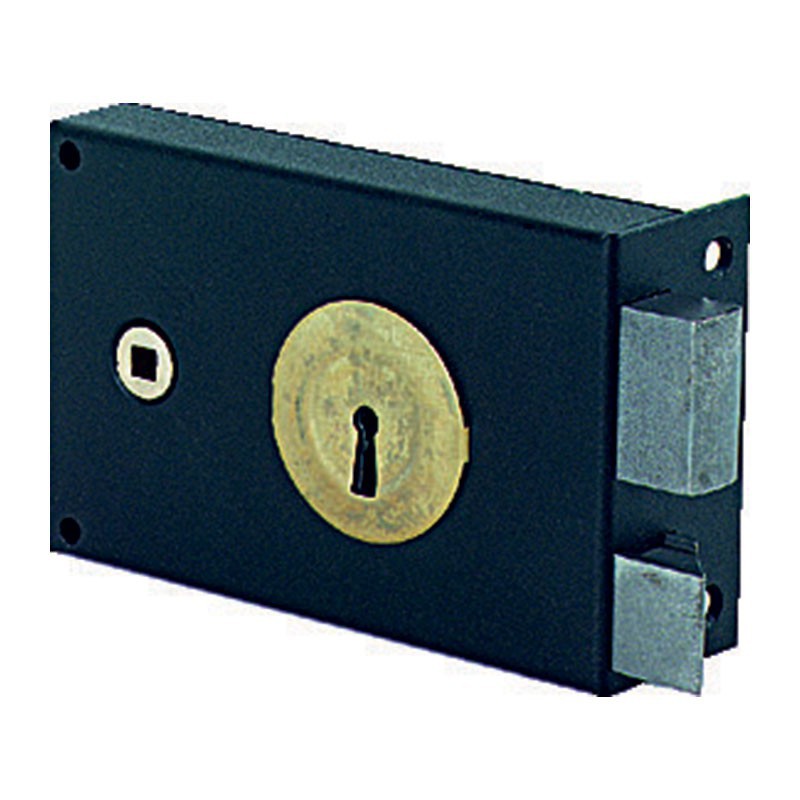 Clés 4 Gorges en acier nickelé - 24 variures, pour grilles, portails ou portillons, fonction équerre, axe : 56 mm - entraxe : 57 mm, finition : peinture époxy noire, carré : 6 mm, pêne 1/2 tour : acier zingué, saillie 21 mm, pêne dormant : acier zingué, course : 28 mm, canons : 40 mm, livrée avec gâche et vis de fixation, 2 clés (série A ou B).