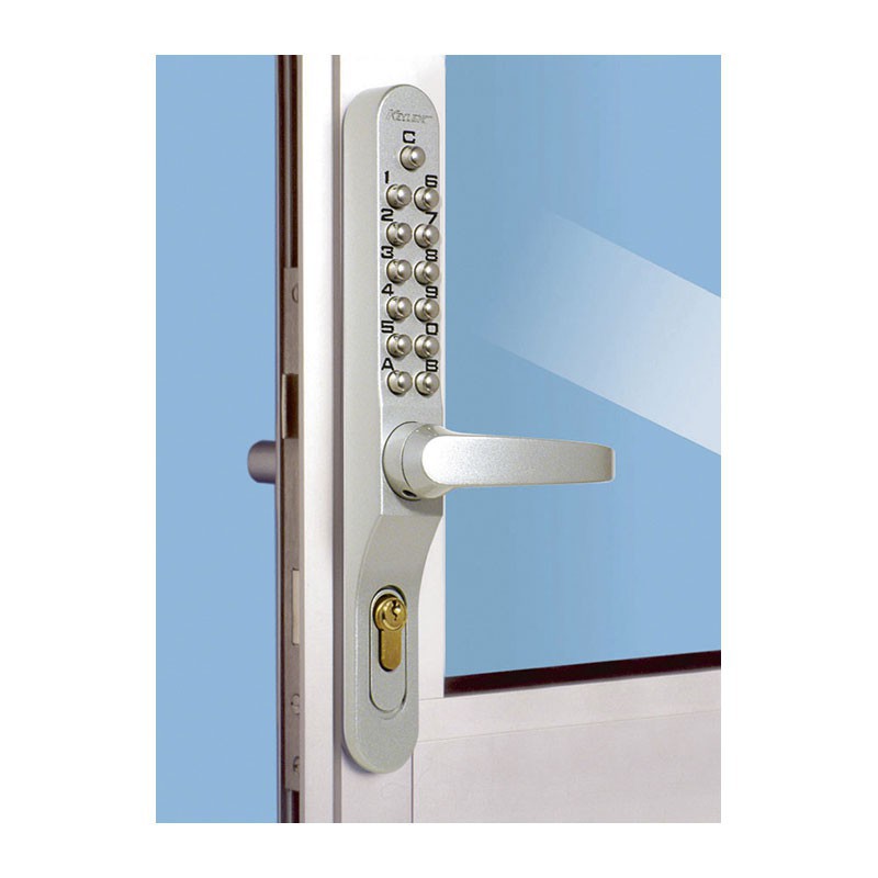 Contrôle d'accès mécanique boîtier à code et garniture intérieure, montage facile sur tous types de serrure monopoint, idéal pour les profils étroits, codage rapide par simple rotation d'index sans ouvrir le boîtier, pour porte d'épaisseur 30 à 50 mm, entraxe de fixation standard 195 mm, réversible main droite ou main gauche, corps et béquille en zamak, touches en acier inoxydable, axe à 25 mm minimum, entraxe réglable par plaques 70/72 et 90/92 fournies, carré de 7 mm.